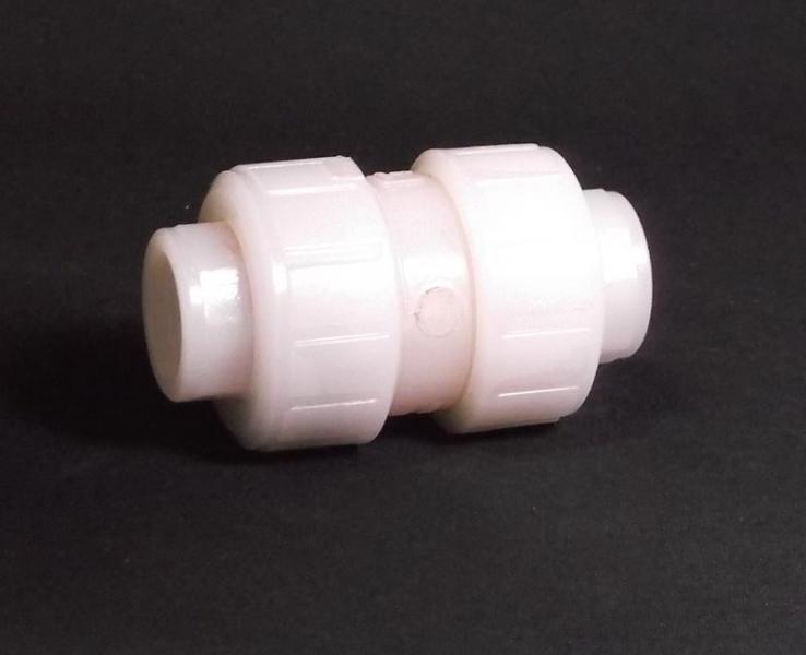 The PVDF ball check valve is the best bet when you want a non-return valve for use with aggressive chemicals. This valve works in both horizontal and vertical applications and will handle most slurry and suspended solid media.